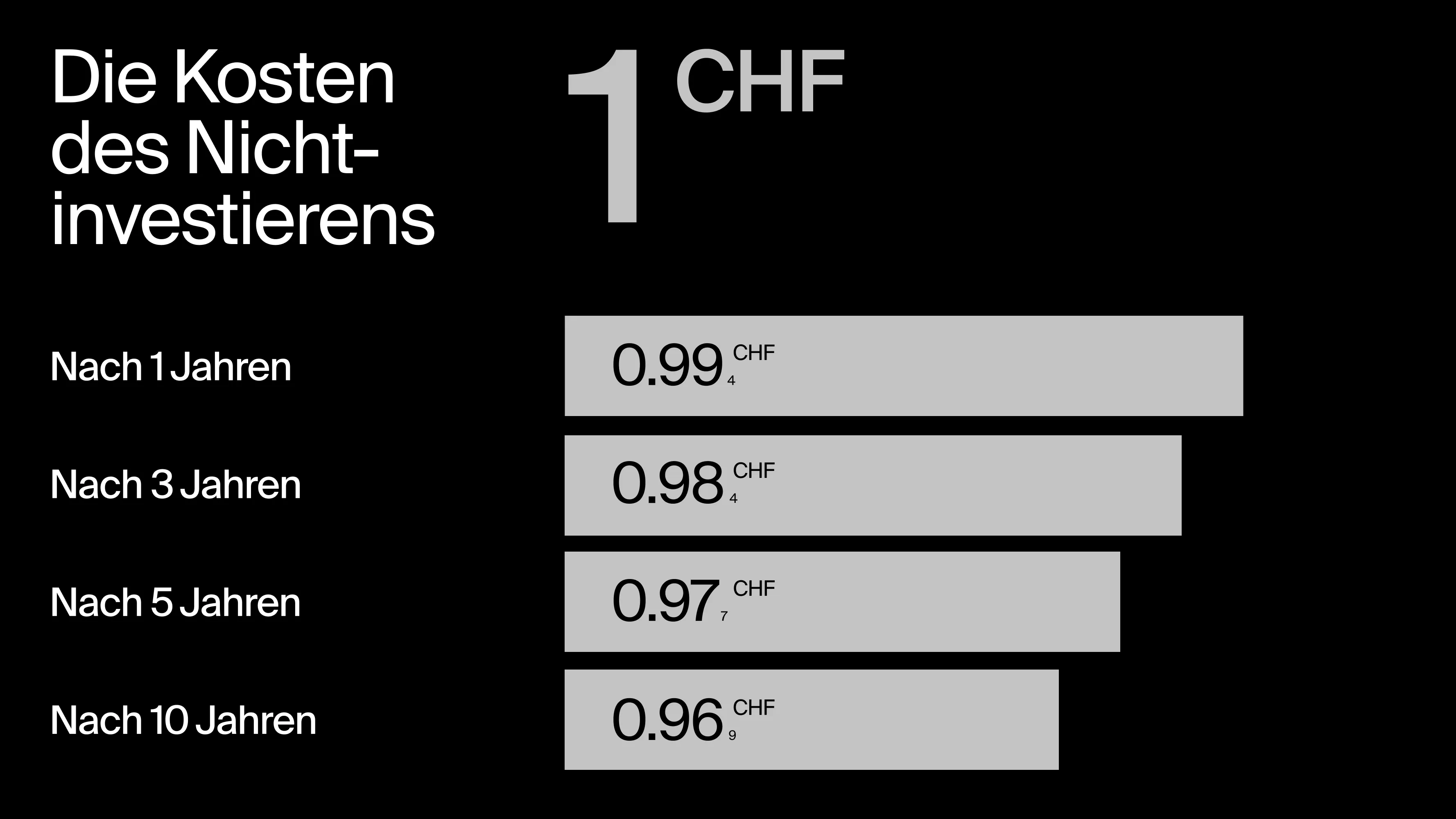 Das Halten von Geld hat seinen Preis. Wir zeigen Ihnen*, wie der Wert von 1 CHF unter dem Einfluss der Inflation im Durchschnitt über verschiedene Zeiträume gesunken ist.