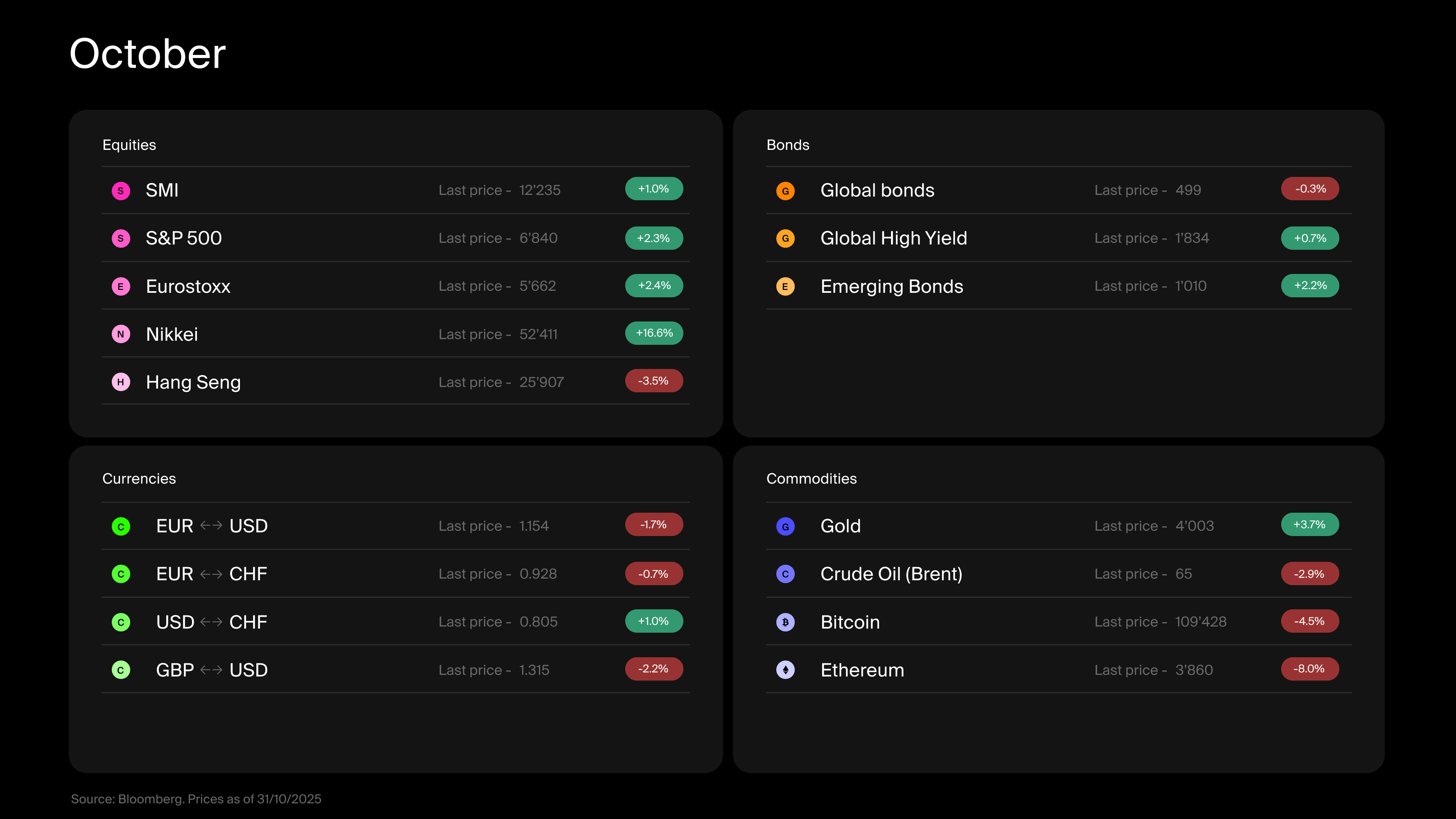 Le rythme d'octobre semblait régulier, mais incertain. Les marchés actions grimpaient toujours plus haut, frôlant des niveaux records, pourtant plus ils montaient, plus les applaudissements se faisaient discrets. C'est le paradoxe du succès : quand vous atteignez le sommet, l'air se raréfie et le silence devient assourdissant.