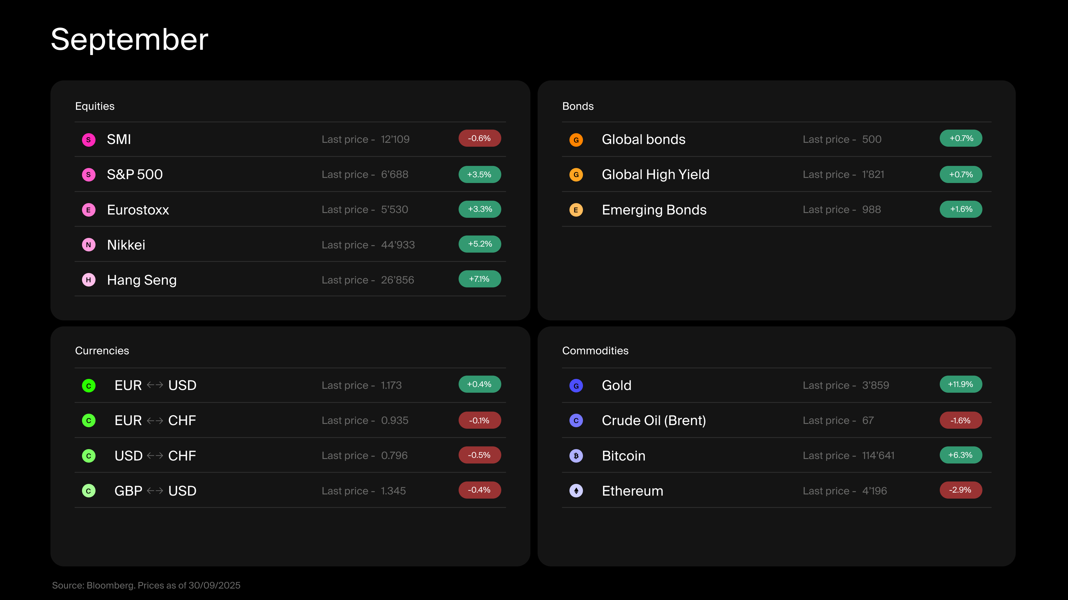 Cet automne, les marchés testent une fois de plus leurs limites. Les actions ont terminé le mois de septembre à des niveaux record, les obligations ont retrouvé de la vigueur après la première baisse de taux de la Fed, et l’or a conservé tout son éclat. Lorsque les frontières se déplacent ainsi, elles ne modifient pas seulement les prix, elles redéfinissent aussi la manière dont les investisseurs perçoivent le risque et les opportunités.