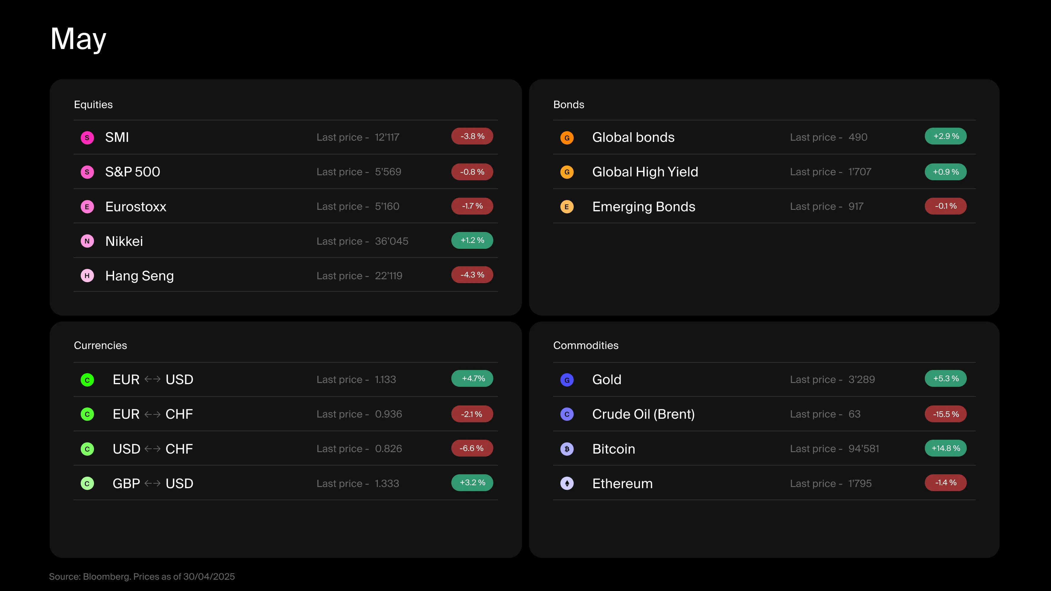 Come abbiamo anticipato, l’audace strategia della Casa Bianca ha presto trovato resistenza, dando agli investitori un’occasione di riprendere fiato. I mercati azionari si sono ripresi verso la fine del mese, seppur non ancora ai livelli di febbraio, ma sufficientemente da accendere un barlume di speranza. (Mentre sto scrivendo ciò, le azioni globali rimangono sotto del 10% dall’inizio dell’anno in termini di CHF).