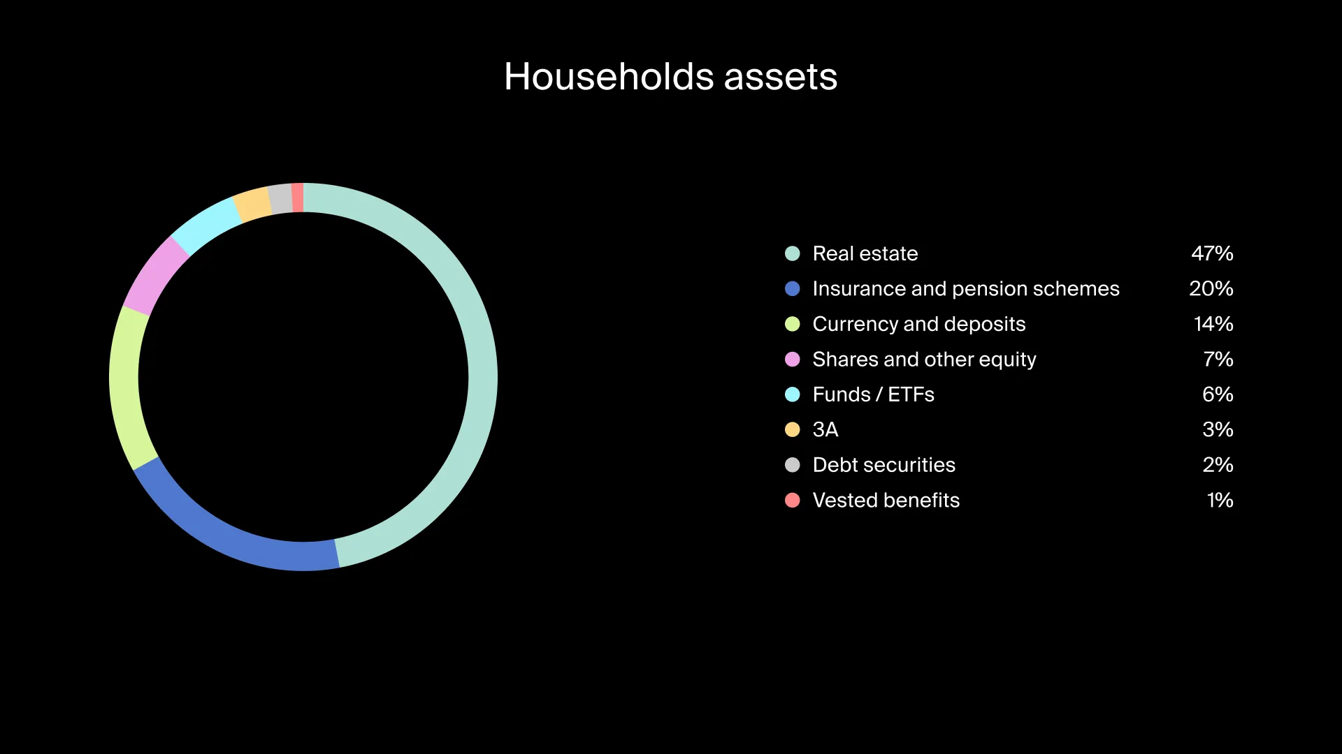 Come era prevedibile, gli immobili dominano la ricchezza delle famiglie e il debito che ne consegue. In secondo posto c’è il secondo pilastro, quei contributi mensili trattenuti dai nostri salari e investiti sui mercati finanziari per garantire la nostra pensione (o almeno quella dei pensionati di oggi).