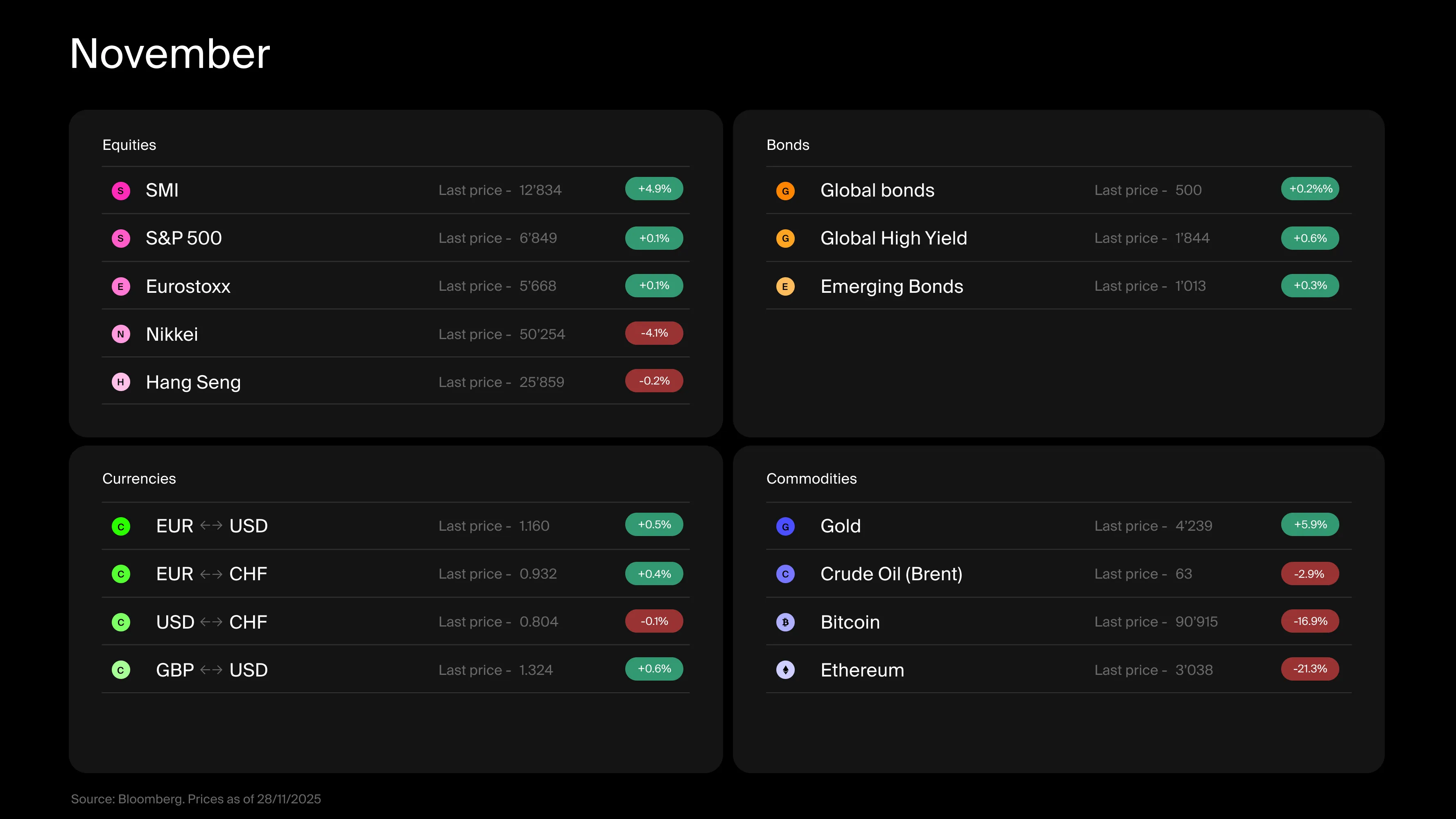 Iniziamo con un’occhiata veloce ai mercati. A novembre non è stato esattamente un mese da celebrare per le azioni. La maggior parte dei maggiori indici, da U.S.A. a Europa e Cina, hanno chiuso il mese in modo piatto. L’unica nota positiva? La Svizzera, dove le azioni sono salite del 4,9%, grazie anche al sollievo del sapere che i dazi sarebbero stati più benevolenti di quando si temesse.